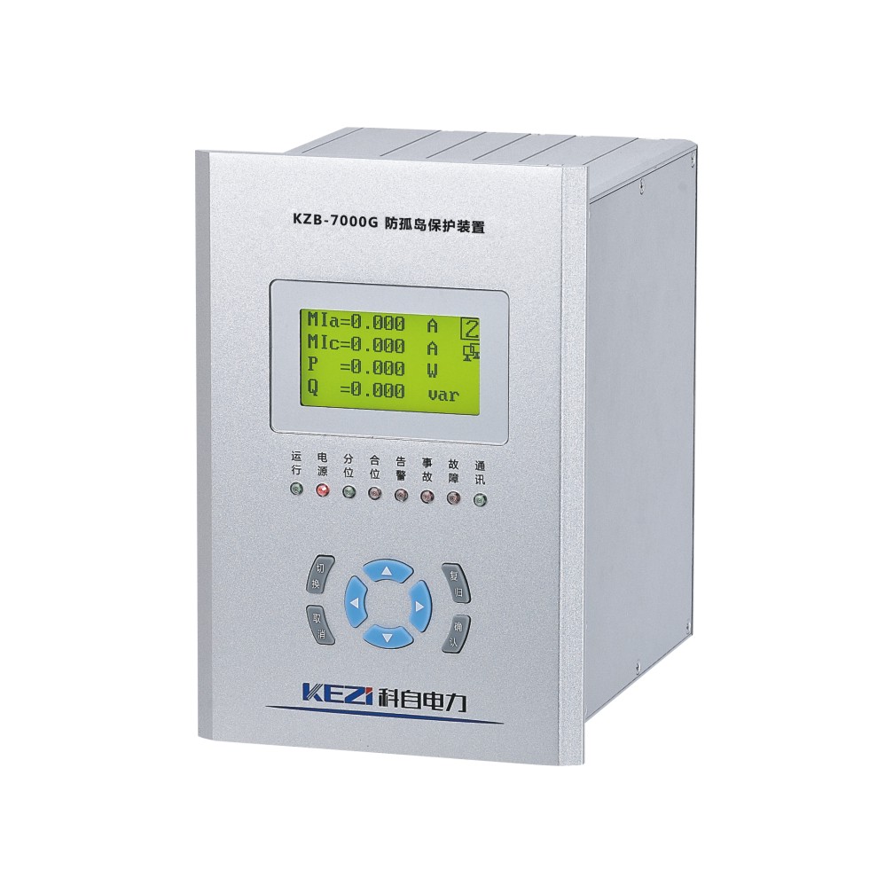 KZB-7000G防孤岛保护装置主要适用于35KV、10KV及以电光伏电站、风电站的小电源并网供电系统,在发生孤岛现象时,作为后备保护可以快速切出分布式孤岛电源。该保护装置具有低频、高频、频率突变、低压、高压、逆功率、线路失压跳闸、有压合闸、谐波超量、联跳等保护功能。主要功能